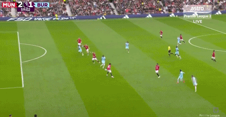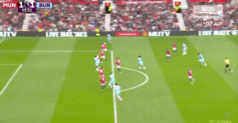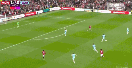 上半场补时第5分钟,曼联快速反击,齐尔克泽中路分球,姆贝莫突入禁区之后无私横传,迪亚洛推射高出,错失破门良机。
